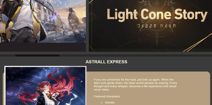 This is a personal fanmade website for Honkai: Star Rail lightcones. I made the website using only html and css, no predrawn UI or plugins.